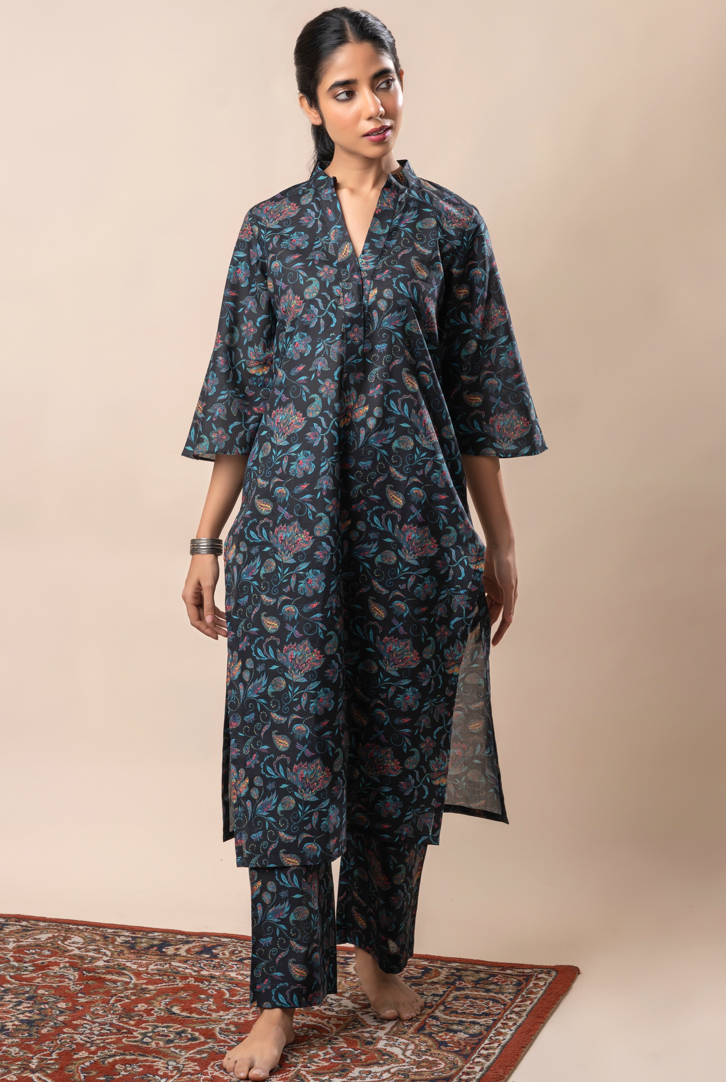 Enhance your casual occasions with Black Floral Jaal Printed Pure Cotton Straight Kurta Set. The kurta boasts a digital print, a mandarin collar neck, and pockets on both sides. Paired with narrow, straight-fit pants matching the overall style and featuring pockets on both sides, this set is perfect for all your casual occasions. Add minimal accessories to adore the look.
