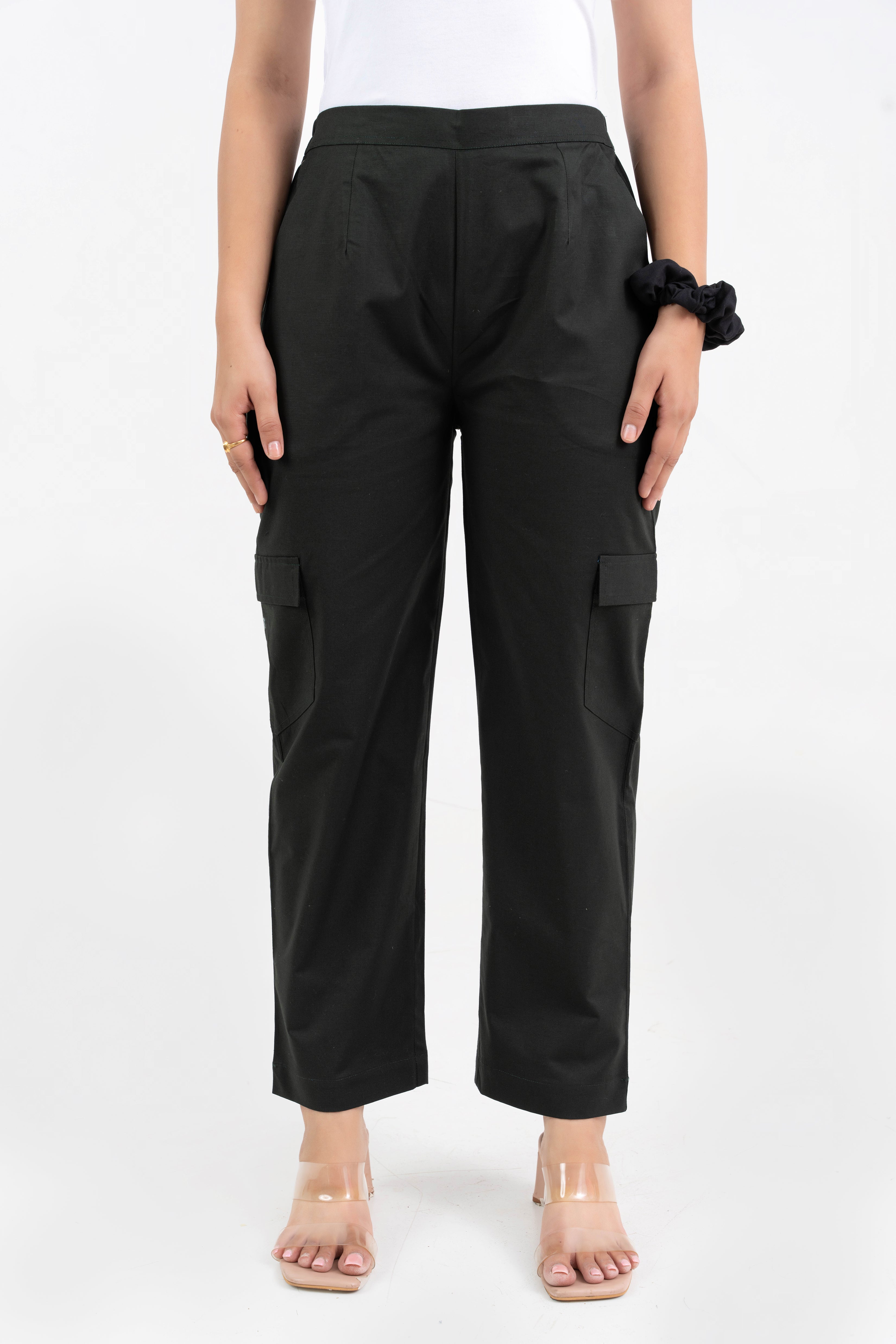 Spruce up your look or spend the day comfortably in the Black Pure Cotton Solid Cargo Pant. Made from pure cotton, it features a mid-rise fit, a half elasticated waistband, side pockets, and a relaxed fit. Pair it with a short top and you will never go out of style.
