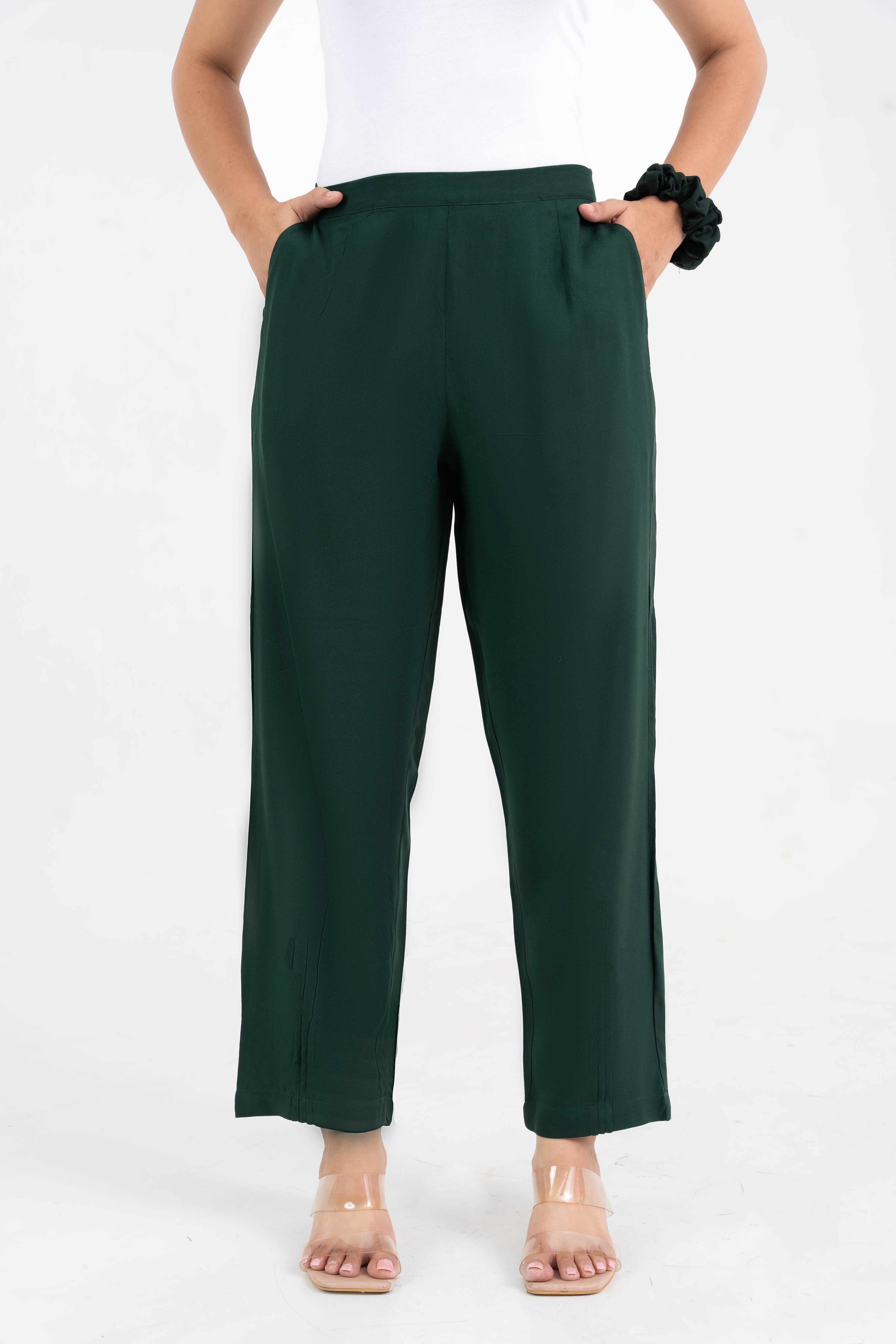 Made from soft viscose fabric in a rich jewel tone, this Green Solid Pant with Pleated Bottom will complement many tops in your wardrobe. They feature a straight fit, mid-rise, half elasticated waistband, and pockets on both sides with pleats at the bottom. With a tapered bottom and ankle-length hem, these cropped pants are perfect for a polished appearance when paired with a neutral or jewel-toned shirt, flats, and minimal jewelry.