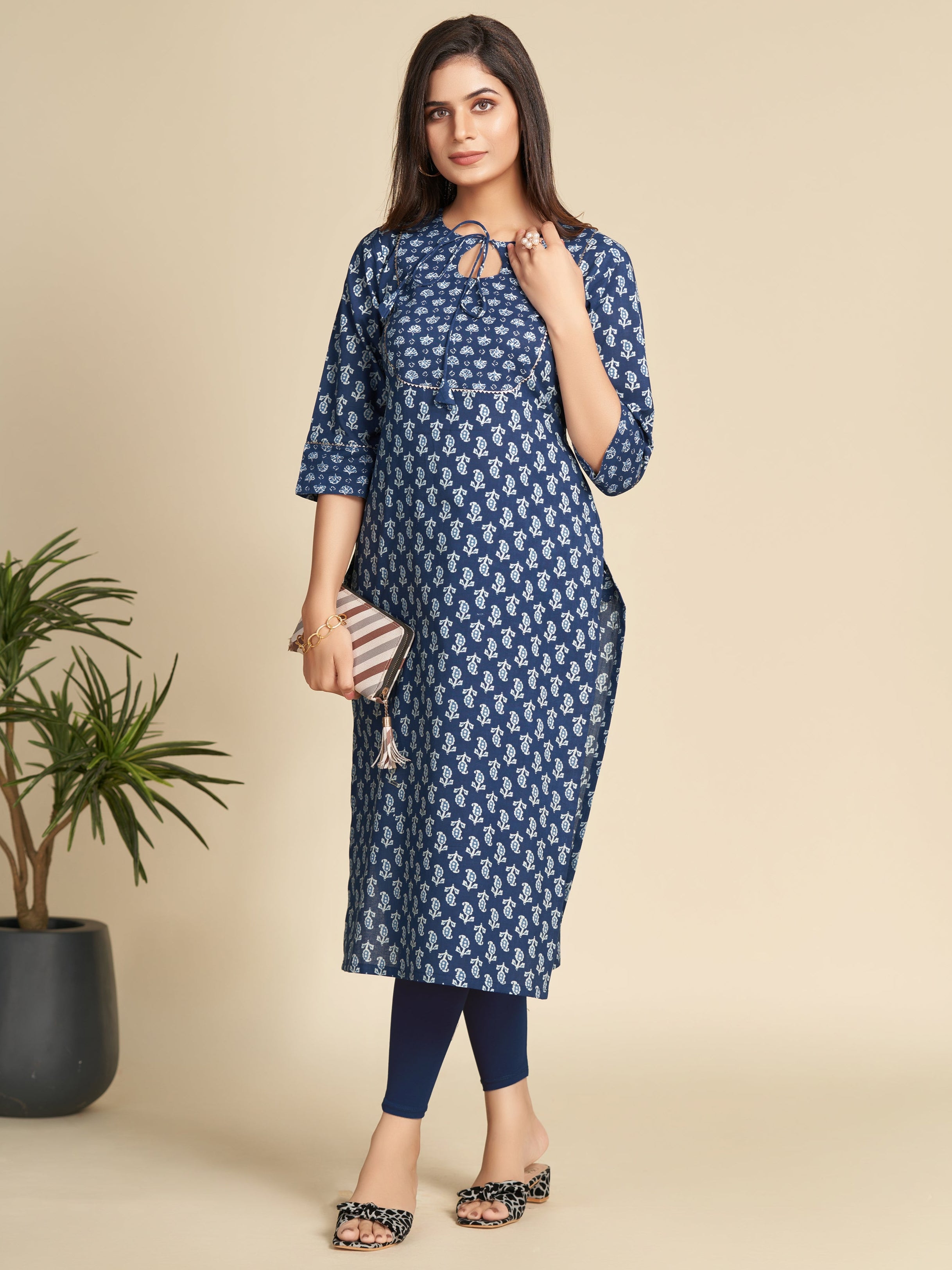 Elevate your style with our Indigo Block Printed Pure Cotton Straight Kurta. Featuring hand screen-printed indigo patterns, a keyhole neck with tassels, and pockets on both sides, this kurta combines modern design with classic comfort. Perfect with minimalist silver jewelry and a white handbag for a chic everyday look.