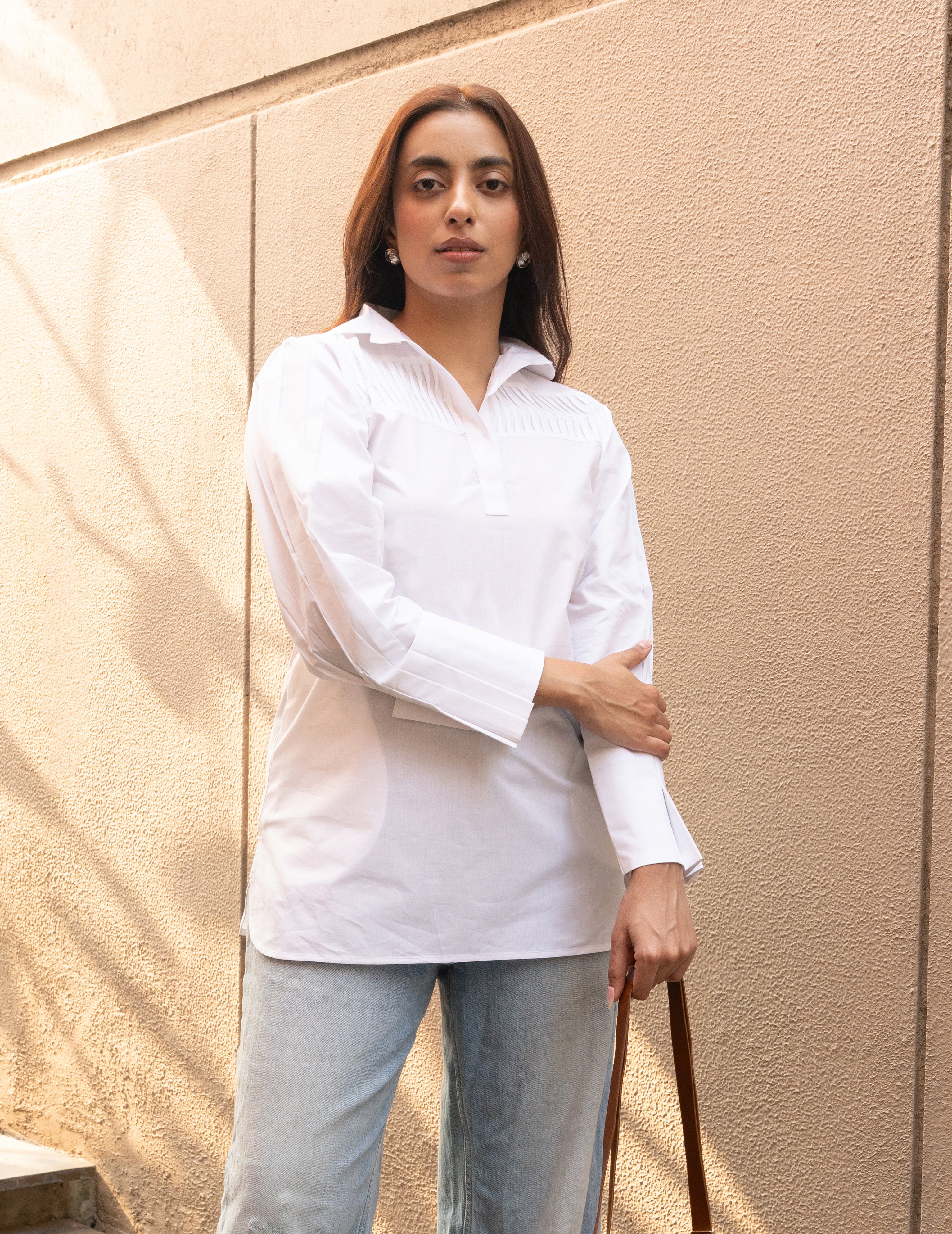 Upgrade your summer style with the White Solid Knife Pleated Collar Top, crafted from premium pure cotton for unmatched comfort. Featuring a classic design with a stylish pleated collar and cuffs, it’s perfect for workwear or a casual look. Pair it with broad-fit jeans for effortless elegance.